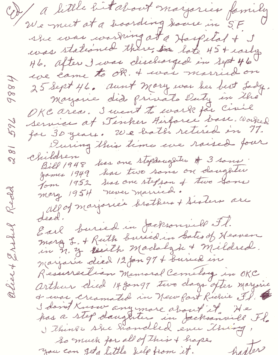 spent early years residing with GM Louisa at Littleton Ridge.... lifetime RN.... resided OKCity, OK.... m: 25 September 1946, in OK, to Baxter Gann, a US Marine home from duty in SoPac (WW2), whom she met while working in SF.... w: Mary Haggerty, Aunt & Best Lady.... (while I was passing thru SF going oversea's Majorie made sure this soldier went to Sunday Mass & had enough beer for the weekend, EDC).... migrated w/Bax to OKCity, OK.... raised a family, 4 kids: Bill, James, Tom & Mary.... he worked, now retired, USAF (civil), Tinker AF Base.... she private duty nurse.... both retired 1977.... she interred: Resurrection Mem RCCem, OKCiyu, OK |PIX: Redd's & Gann's| |See Bax note ... X|