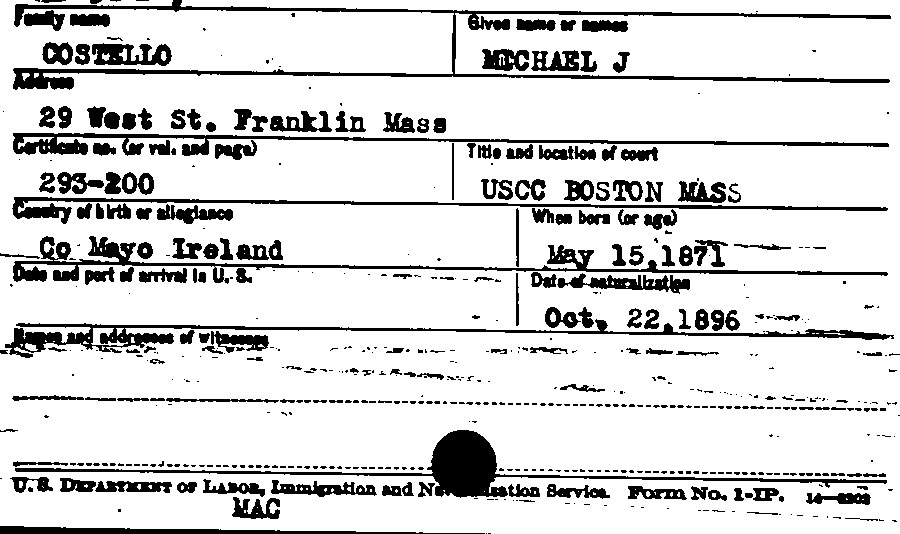 ^Michael J Costello, 15 May 1871 Ballindine, Co Mayo Ireland-? USA.... lived at 29 West St & Alpine St, Franklin MA.... obtained his USA citizenship 22 October 1896.... a Boston Rubber Co employee.... m: Mary L _____ .... she b: 1884 in Ireland.... he may have served as USPS Postmaster at Franklin MA for the period 16 February 1937-31 March 1952