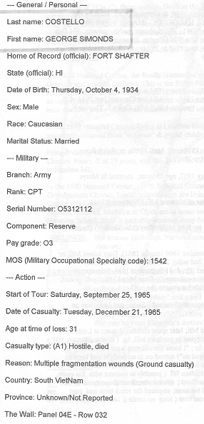 From the Army records: Costello, George Simonds; HI; b: Thursday 4 October 1934 (Washington DC); married ; Army; Captain (Reserve); SN: 05312112; MOS:1542; Start of Viatnam Tour: Saturday 25 September 1965; Date of Viatnam Casualty: Tuesday 21 December 1965, Age: 31 years; Casualty Type: hostile, died, multiple fragmentation wounds; Country: South Viatnam; The Wall: Panel 04E- Row 032