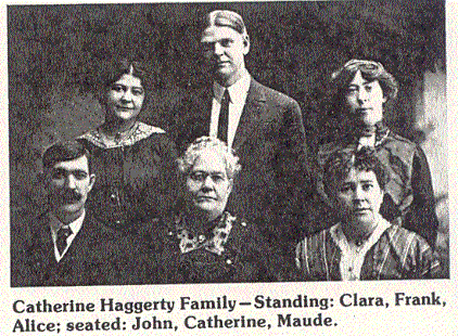 Around the year 1893, Frank left Catherine and their five children and moved to Bemidji, MN where he worked in a lumber camp. It is believed that he died there (date unknown). Catherine loaded her possessions and her five children into a lumber wagon and moved to Sisseton, SD where Catherine became the proprietor of a hotel. This hotel was mostly a boarding house for men. In the year 1897 she sold that hotel and erected a new building where she operated a first class hotel. called the Commercial Hotel, and enjoyed a large patronage. The Commercial Hotel was a beautiful building that was surrounded by a pillared porch. This is where she remained until she died on July 8, 1927. Catherine is buried in Beardsley, MN, St Mary's Cemetery. Her tombstone is located about fifteen feet directly from the front gate. According to newspaper clippings sent from Dorothy Haggerty/Jensen, Catherine Haggerty died at the home of her daughters, Mesdames Holland and Pearson, ten miles west of Sisseton. Dorothy Haggerty/Jensen has corrected that information with the following "I remember my grandmother's death at our farm out of Sisseton. We kids always said our prayers at Grandma's lap and I remember her asking us to pray for her death the night or so before she died. I also recall how I felt. This was such a terrible request. I was only about 61/2 years old". The funeral services were held at the home of her daughter, Mrs Maud Pearson in Drywood Lake Township and at the Catholic church in Beardsley, Minnesota to which place the remains were taken and buried in the family lot in Beardsley cemetery. The article refers to her as ""a woman with a heart of gold, her generosity knew no bounds and she never turned a deaf ear to the needy and afflicted"".
